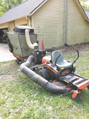 He mounted an old Bluebird vacuum powered by an 8-hp. Honda motor to the back of his mower.