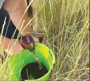“There are some probes that are reinforced for hammering, but I’ve been using the bucket and auger device instead. I just set it down, drill down to depth, and the soil collects in the bucket. Then I go on to the next of several spots and collect more samples. The pour spout on the bucket makes it easy to fill the sample bag.