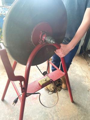 I wanted to do something with the stone, so I put my pipe bender to work and made a frame for it to sit in, says John Krueger. I patterned the frame after an old pedal-powered grinder. I used 1 1/4-in. pipe and shaped the two sides as close to each other as I could.