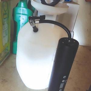 Halstead drilled a small hole at the top of the sprayer and inserted a valve stem. He then used Velcro to attach a small hand-held air compressor, set the pressure to 15 lbs., and away he went.