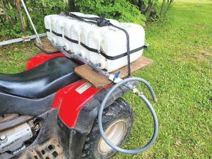 “I used a couple of ratchet straps to hold the jugs together and attach them to a 1/2-in. plywood platform mounted to the ATV’s rear platform,” says Hufford.