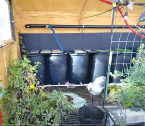 Credit for the winter warmth and summer cooling is shared by the insulated in-ground and above-ground walls, the heat bank of 68 blue water barrels running the length of the back side of the structure, the angle of the roof line, the 24-in. insulated blanket above the front 18-in. stem wall, and the cold air drops. Foam sprayed on the end walls, rear wall, and roof helps to seal out cold air. Screened windows and doors at each end facilitate air movement in the summer.