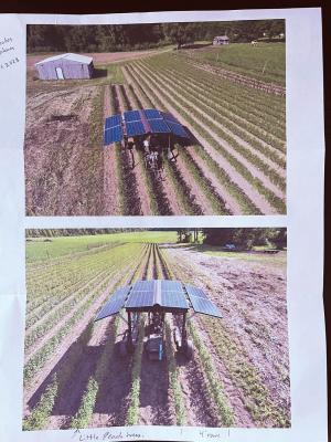 Golf Cart Converted Into Solar Tender ENERGY Solar “I converted a golf cart into a solar-powered vegetable and plant tender ” says New York nurseryman Abram Schlabach “It’s so quiet and works so well that we can hold ‘business meetings’ while we do our cultural care work at a consistent speed It’s like working on an assembly line ” Now he and his two brothers can work in the shade while weeding staking pruning suckering and caring for young peach trees Schlabach got the idea for building the cart after seeing gas engine-powered equipment at other nurseries “I went to a local golf cart dealer and told him I wanted to buy a cart but only needed the rear axle motor battery and controls ” Schlabach says “I told him he could have the rest for parts so I think he gave me a good deal ” Schlabach built a frame to hold the solar panels out of 8-in by 2-in I-beams that he scavenged from an old mobile home Solar panels attach to a wood floor on the frame His total investment of just over $4 000 produced a cart that the nursery has used for 4 years running it all summer without the need for supplemental charging Schlabach says each of the eight solar panels produces 295 watts of power The outer panels fold down for easy transport The motor on the three-wheel tender drives a single 16 5 front wheel Steering is done by limiting switches and solenoids “The self-steering works well ” Schlabach says “I used a right-angle steering box and set it up to steer like an old tractor Ninety percent of the time it won’t need any correction ” The tender is geared to drive at 0 6 mph which Schlabach says is just right for most of the work on their 5-acre nursery “The rig isn’t designed for hills which is fine because our nursery is on flat land so climbing isn’t an issue A climbing tender would probably need two-wheel drive and a different self-steering system ” he adds The tender will carry up to 1 500 lbs and allows three to four people to work on four rows at a time while sitting or kneeling on mats The floor is only 4 in above the ground Schlabach’s father started the business in upstate New York near Lake Ontario 25 years ago Today the three sons run the business providing well-cared-for plants to nearby customers and occasionally even inventing interesting equipment Contact: FARM SHOW Followup Schlabach’s Nursery 2784 Murdock Rd Medina N Y 14103