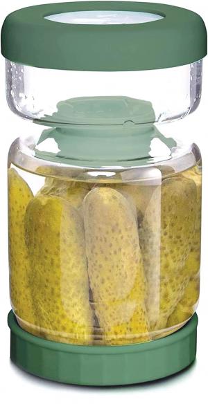 Hate having to stick your fingers into the brine to pull a pickle out of a jar? Then a flip jar might be the answer. This hourglass-shaped jar separates pickles from the brine for a short time, making for less mess. It can be used for any foods stored in liquid.
