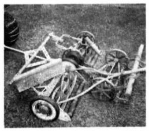 "The advantage of the reel mowers is that they aren't as rigidly mounted as the deck mower so they `float' over uneven ground without skinning the lawn on high spots like the deck mower does. They also spread the grass clippings out straight behind without leaving wind-rows. Even if the grass gets a little long I never have to rake anything up. Each mower in front overlaps the rear mower by about an inch so the total cutting width is about 46 in. It's fun to use, but it's definitely home-built. My wife won't go outside while I'm using it because someone might see her."