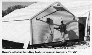 "Whether you have one sow or ten, routine maintenance remains the same," says Rodney Koser, of Elbow Lake, Minn., manufacturer of the new building. He designed it with solid, all-steel floors and a sealed wooden manure pit buried outside the building to eliminate inside-the-building pit fumes, which, he says, can slow growth of baby pigs. "Pigs will weigh more at three weeks in this house than in any other setup I know," he says.
