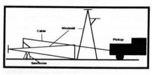 "If desired, a winch can be mounted on the pickup and used to raise or lower the windmill. A sawhorse or barrel is needed to keep the fan off the ground and to keep the leverage point high enough so that the windmill can be easily raised back up"