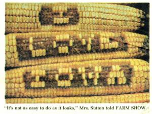 By shelling out some kernels and leaving others in place on the cob, the words or designs are developed. "But it's not as easy as it may look," says Mrs. Sutton. "It has to be done at just the right time. If the ear is too wet, the kernels won't come out. If it's too dry, the kernels that you want to leave on the cob won't stay in place."