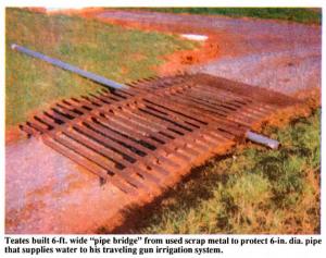 Warren Teates, of Rustburg, built his "pipe bridge" from used scrap metal to protect a 6-in. dia. pipe that supplies water to his traveling gun irrigation system.