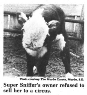 Cheryl adds that Super Sniffer romps about the pasture with the other calves and her mother seems to be very proud of her unusual calf. "I could never give her to a circus," Cheryl notes, referring to suggestions from several people. "I'd be afraid she would be taken care of improperly."