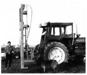 The steel cable and pulleys make the stroke of the hammer twice as long as the cylinder. It takes longer to drive to the next post than it does to drive it," says Coulter. "A metal helmet covers the top of the post and is equipped with guides that hold the post in line."