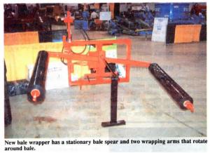 Higgins also manufactures a new round bale wrapper that consists of a stationary bale spear and a pair of rotating arms, each holding a roll of plastic. One arm at a time is used to wrap plastic around the bale.