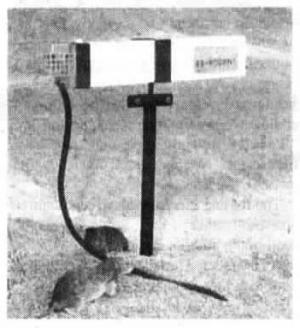The 2-ft. long trap mounts about 1 1/2 ft. off the ground on a metal pedestal. A rope tied to a bait cage at one end of the trap trails down to the ground. When a rat smells the bait, he climbs the rope, pokes his head up into the cage, and breaks the beam of an electric eye, triggering a piston that shoots out and breaks his neck. The rat dies instantly and falls to the ground beneath the trap.