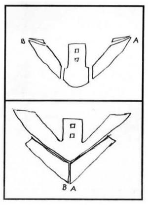"Usually what happens is that the front part of a sweep wears away, leaving the wings at the rear at almost full width. I cut off the wings and remove a small wedge at the back (B & Ain the drawing) so the wings fit together properly at the front joint (B-A in the drawing) when the cut-off wings are turned end for end.