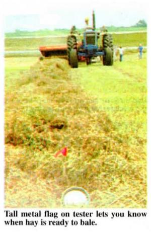 A tall metal flag on a wire is set at the critical point on the tester. In Dickey's case, he sets the flag at 35 percent and the flag lets him see at a glance if the needle is at 35 or below. The flag also makes it easy to find the tester in the windrow.