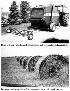 The tag-along cradle allows him drop bales off in rows as they're made, making it easy to pick them up when the baling's done.