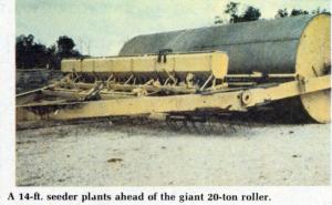The giant 20-ton roller they developed is made of 3/8 in. steel plate. Ahead of the roller, 4 rows of flexible tines and a salvaged, 14-ft. long seeder dig up the soil and plant. As the machine is pulled at about 4 mph, seed is dropped, harrowed and covered by the ridge of soil pushed up by the roller. Any rocks in the way, up to 2 ft. in dia., are pushed into the ground.