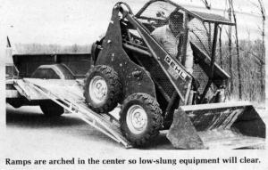 The arched skids are equipped with angle iron cleats at both ends. Either end can go against the pickup. Traction, even if it's raining or snowing when you're loading equipment, is no problem, thanks to the ramp's expanded metal track.