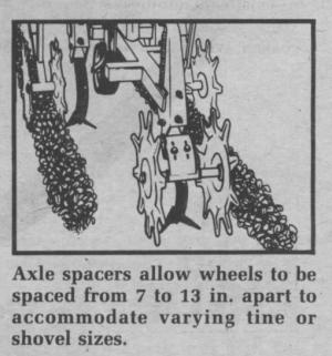 Rather than running over the row, the new shield mounts directly to the rear tine or shovel. At high speed, thrown soil bounces off the shield's rolling wheels and back towards the row center, creating a leveling action.