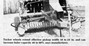 The spider-type Tucker wheels attach to the windrow pickup with one wheel operating on each side. Designed to fit all big balers with an A-frame hitch, the attachment, according to the manufacturer: