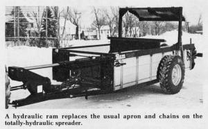 Hydraulics replace the usual apron, chains, gears and sprockets found on conventional spreaders. A hydraulic motor drives the drum beater, thus eliminating drive chains. There's no need for special hydraulic attachments on the tractor because the self-contained hydraulic system runs off the tractor's PTO.