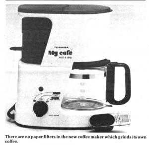 "You put beans directly into the coffeemaker and grind just what you need. The coffee drips into the stain-less steel filter and begins to brew," explains Dee Geisness, manufacturer's representative for Toshiba in Mound, Minn.