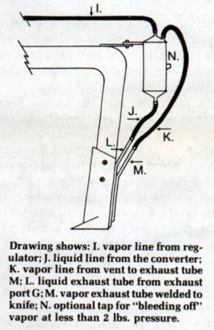 "Our units are designed to maintain a constant pressure of about 2 lbs. per sq. in.," explains Louis Siebert, owner-operator of Lou's Custom Machine Shop, Henderson, Neb. His concept for applying anhydrous as a liquid uses a converter for each row, rather than a central conversion box.