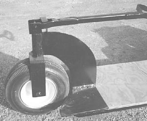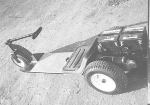 The cart is 22-in. wide, 73 in. long, and 17 in. high in back and has a frame made out of 1 in. sq. tubing. Rear axles are fitted with 4.00 by 8-in. tires. There's a single 3.50 by 6-in. tire on front. The cart runs just 5 in. off the ground. The operator sits in a lawn mower seat which is adjustable on the frame to accommodate operators of varying heights. Vegetable containers are placed on a 14 by 22 in. plywood deck in front of the operator.