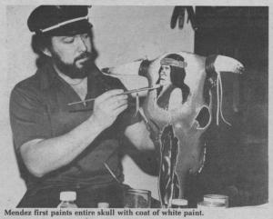 One of this favorite skulls has a bright red background and has the figure of an Indian chief painted on the forehead. "The Indian was enough decoration for this particular skull," says Mendez. "I blended and faded the dominant red color to appear like the sun's rays protruding from it. It gives the painting an interesting effect."