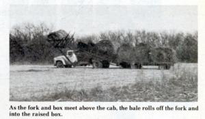 A front-mounted fork picks up individual bales, then lifts them up and over the cab and into the truck box. With a 16 ft. tag-along trailer hitched behind the truck, John can load and transport up to 7 or 8 bales at a time, depending on their size, without leaving the driver's seat (3 bales on the trailer, 3 in the truck box and 1 on the front-mounted fork).