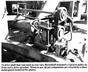 To drive the new pto, he installed heavy duty no. 80 roller chain on the front cart's drive sprocket. He mounted a triple pulley on the drive sprocket which then belt-drives the pulley on the add-on pto shaft. The top pulley mounts on a hinging steel plate which is moved up and down by a 6-in. hydraulic cylinder to engage and disengage the rear cart's pto.