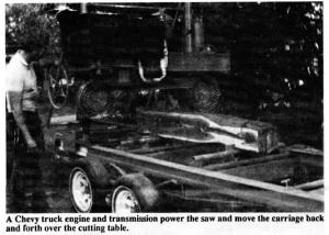 The saw is powered by a 4-cyl. Chevy truck engine and transmission that mounts on the saw carriage. A right angle gearbox, salvaged from a junked forage harvester, mounts on the output shaft from the trans-mission and drives a pair of car hubs that carry the bandsaw blade. The original tie rods are used to loosen and tighten the hubs. The blade is water-cooled by water that drips onto it from a 5-gal. container mounted above the engine.