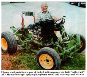 "I can go almost anywhere without worrying about tipping over," says Uhnken. "The wheels are spaced 6 ft. apart and will straddle two 36-in. rows. I have 10 1/2 miles of road sides to spray so the wide track re-ally helps. Top speed is about 23 mph. It has the Volkswagen car's torsion bar sus-pension system, steering wheel, and steering gear so it drives just like a car. It also has the original foot throttle, clutch, and brakes. I wish it had a little more than 8 in. of clearance so I could use it in taller soy-beans. I paid $1,050 for the engine, $100 for the Super Beetle, and $200 for a new Deere tractor seat. My total cost was about $1,600. A 4-wheel ATV would have cost at least $4,000.
