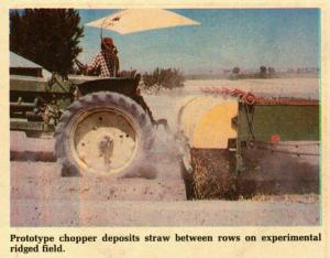 His machine spreads straw at the rate of about 800 lbs. - 15 to 20 straw bales ù per acre, the rate recommended by researchers at the USDA Snake River Conservation Research Center, Kimberly, Idaho. Preliminary results of one study being conducted by Dr. Mel Brown at the Kimberly station indicate that one bean field, with a slope of 1.3% and no straw, yielded 42 bu. per acre while a similar field with straw between rows produced a yield of 51 bu. per acre. Another bean field, with 4.5% slope, produced 32 bu. per acre without straw and 51 bu. per acre with straw in between its rows. A third field with a 1.5% slope yielded 45 bu. per acre without straw and 54 bu. per acre with straw.