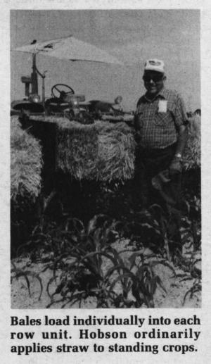 Hobson mounts the bale mulcher on the back of his cultivator and shreds straw into the rows as he does his last cultivation. In 36-in. spaced corn, for instance, he mulches a 12-in. band of straw down the center directly over the irrigation furrow. The width and thickness of the straw layer can be varied by varying tractor ground speed.