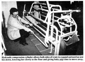 Hydraulic crate keep pigs alive HOG EQUIPMENT & IDEAS Hog Equipment & Ideas (351) 14-2-3 A new European-designed hydraulic far-rowing crate prevents the crushing of baby pigs to increase litter survival rates without the drawbacks of conventional pig-saving devices, according to the distributor, Hog Slat, Inc., Newton Grove, N. C.