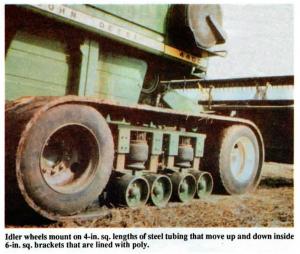 Idler wheels mount on 4-in. sq. steel tubes that move up or down inside 6-in. sq. steel tubes as they flex up or down. The 6-in. sq. steel tubes are lined with poly so there's no metal-to-metal wear.