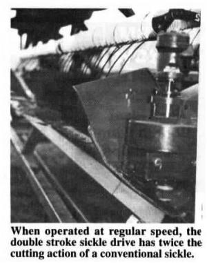 "The Double Stroke drive allows much higher cutting speeds. For every revolution of the gear box pulley you get four cuts, allowing much slower sickle speeds for slower ground travel. If faster travel is desired, just speed up the drive by decreasing gear box pulley size, or increasing drive pulley size.