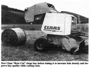 It increases bale density and improves hay quality while cutting costs, according to the company. Hay from the pickup is pulled by a rotor over a bank of 14 stationary knives - spaced 2 3/4-in. apart - before it goes into the bale chamber. It produces 4-ft. dia. bales that weigh up to 2,000 lbs., depending on dry matter. "Bales are up to 30 percent more dense than conventional round bales. That means you end up with fewer bales which reduces baling, wrap-ping, and handling costs. The chopped hay makes higher quality feed," says a company spokesman.