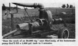 MacCuaig's first project was his high-capacity manure pump that'll fill a 2,000 gal. tank in 3 min. He started with a construction pump he found in a scrap yard and mounted it on a portable frame. At first he powered it with a salvaged truck engine but the engine turned too fast so he switched to a tractor pto. Because the pto turned the opposite direction, he searched the salvage yards for a gear-box that reverses the drive and also boosts tractor pto speed from 540 to 1100. He had to machine a coupler to fit the gearbox. A chain drive powers the pump. It's all mounted on a portable frame built from the chassis of a wrecked Toyota car.