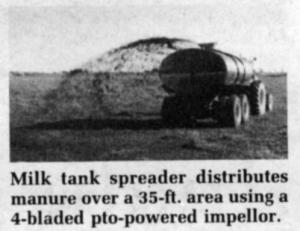 Manure is pulled out of the truck and spread by a 4-bladed, pto-powered impellor fan that literally blows the manure up and out the back of the tank where it hits a deflector plate that spreads it out over a 30 to 35-ft. area.