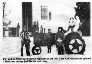 Snow sculptures have become a family tradition on the Tiry farm. They started with simple snowmen a couple years ago, then built a cow with an oversize nose standing by a large milk carton. He uses a front-end loader to pile up snow which his children help wet down with a hose to give the snow a harder surface that can be more easily carved with intricate details. It also lengthens the life of the sculpture. The children also help with the finishing touches and with painting. He used a chain saw to cut the snow into a rectangular block with flat walls, then used a corn knife to carve a pattern of the tractor onto the block before using the chain saw to finish the job.
