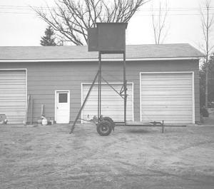 Kurtz mounted the deer hunting stand on the wheels and axle off an old trailer house. The stand consists of an open-top, 4-ft. sq. plywood box mounted on top of a vertical steel frame made from angle iron and pipe. The frame is hinged in the middle, allowing the top half of the frame to be folded forward for transport by a cable connected to a boat winch on the trailer hitch.