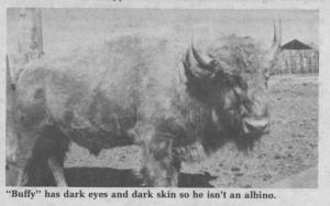 Born on a Kansas ranch to full-blooded dark buffalo parents, Buffy was traded to a restaurant owner by the rancher for a camel. After seeing Buffy at the Oklahoma State Fair, the Piggs bought him from the restaurant owner for $10,000.