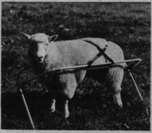 The new sheep cradle consists of a lightweight tubular metal frame with a canvas cradle across the center. The animal is lifted into the cradle, which is then strapped down over its back. Held at a level where its feet just touch the ground, the animal can't move away when presented with a nursing lamb. When not in use, the cradle folds up for easy storage. Sells for about $40.