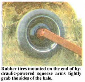 Denstedt's bale mover consists of two hydraulic-powered squeeze arms, each fitted with its own cylinder, mounted on a heavy 3-pt. mounted frame. An auto hub and spindle mounts at the end of each arm. A wheel rim and tire mount on each hub. Both spin freely.