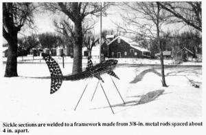 The "Midwest Man-Eater", as it's been called, stands 12 ft. long and 5 ft. high in Nafe's front yard. It's supported by four 1-in. dia. metal rods. The sickle sections are welded to a framework made from 3/8-in. metal rods spaced about 4 in. apart. Nafe used a shop vice to bend the rods to the shark's profile which includes four fins - two on the back and two on the belly.