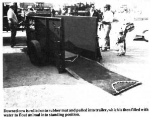 The new "Aqua Cow" system lets you float a downed cow up onto its legs again without using any kind of clamp, belts or chains. You roll the cow onto a rubber mat and use a tractor to pull it into the trailer. Then you close the two watertight end doors and fill the container with water that's been heated to the cow's body temperature. Some of the water can be drained out after 2 to 4 hours, allowing the cow to place more of her body weight on her legs. Once she's ready to walk out by herself, the rest of the water is drained out.