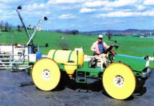 "Finally, what I did was cut 48-in. circles out of 11-ga. sheet metal and welded it to the outside edges of truck wheel rims to the steel circles with steel spokes to the inside edge of each wheel. Two-inch thick commercially available hard rubber buggy tires were applied to the narrow wheels at a buggy shop. "Wheels are on 60-in. centers and I can spray at up to 5.5 mph. It has a 150-gal. spray tank with double agitation. An 8-hp. Honda motor powers a centrifugal spray pump which is also used to fill the spray tank. Spray booms are 390 in. wide, letting me side dress twelve 30-in. corn rows using drop nozzles. Nozzles are set up for both 20 and 30-in. rows. I also added a foam marker, acre counter, and other gadgets.