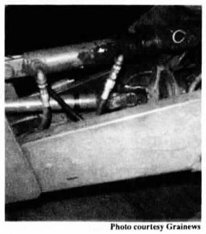 When Nemeth removed the ratchet jack, there was only room for a 5-in. long hydraulic cylinder. So he cut 3 in. off a 21/2 by 8-in. cylinder, then welded the yoke back on the cylinder and "pinned" it to mounting holes for the ratchet jack. The cylinder hoses are connected to tractor hydraulic outlets.